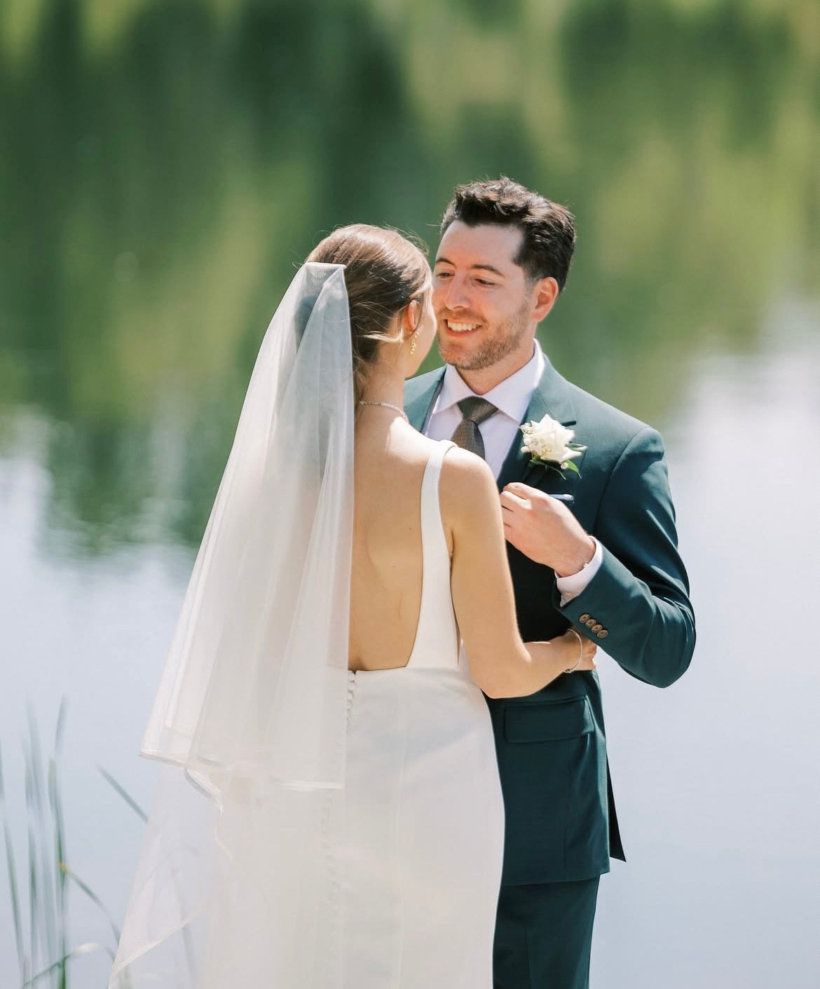 Carmen - robe de mariée moderne ajustée et épurée à encolure carré et ouvertures transparentes sur les côtés